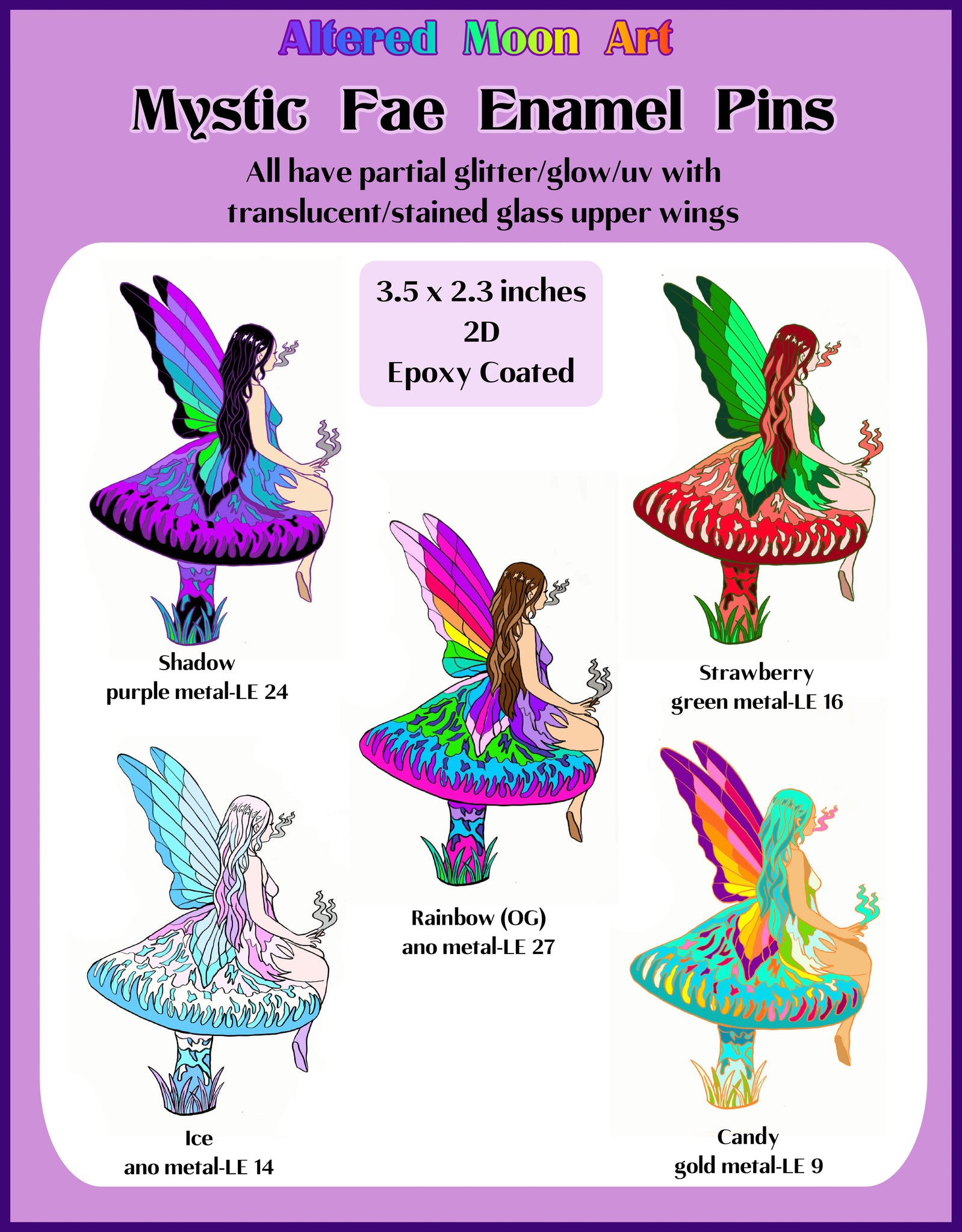 Artist name (Altered Moon Art), Mystic Fae and LE numbers stamped or sand blasted on the back.