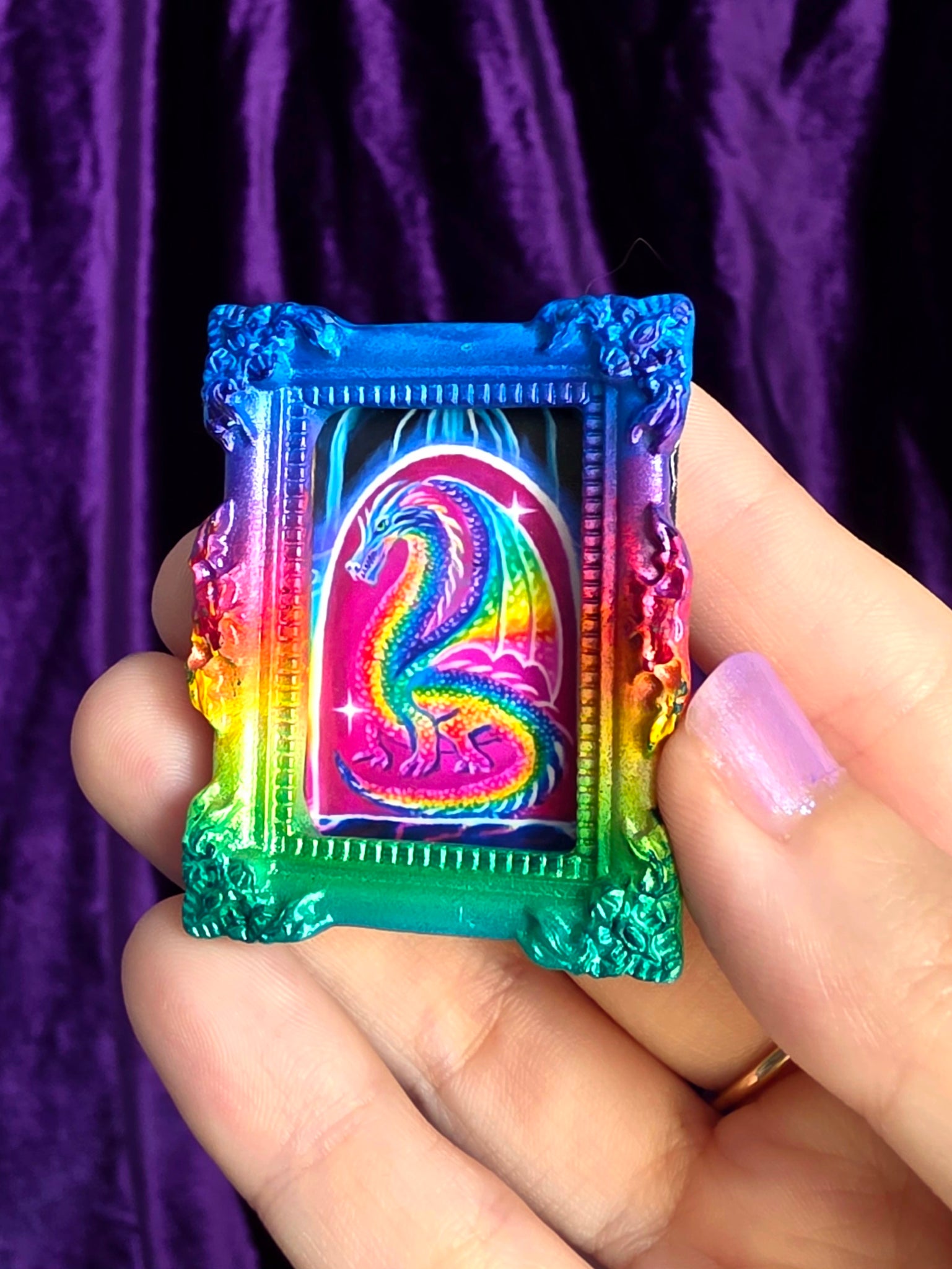 One of a kind mini frames featuring prints of my original artwork! These are pearlescent and shiny and are signed on the back and assembled with lots of love! 5 options at different sizes, all except the coral gateway and mint green tiger are painted by me. Read below to see sizing info. All of these come with mini print extras (not prints that fit in the frames- just some extra little gifts <3)