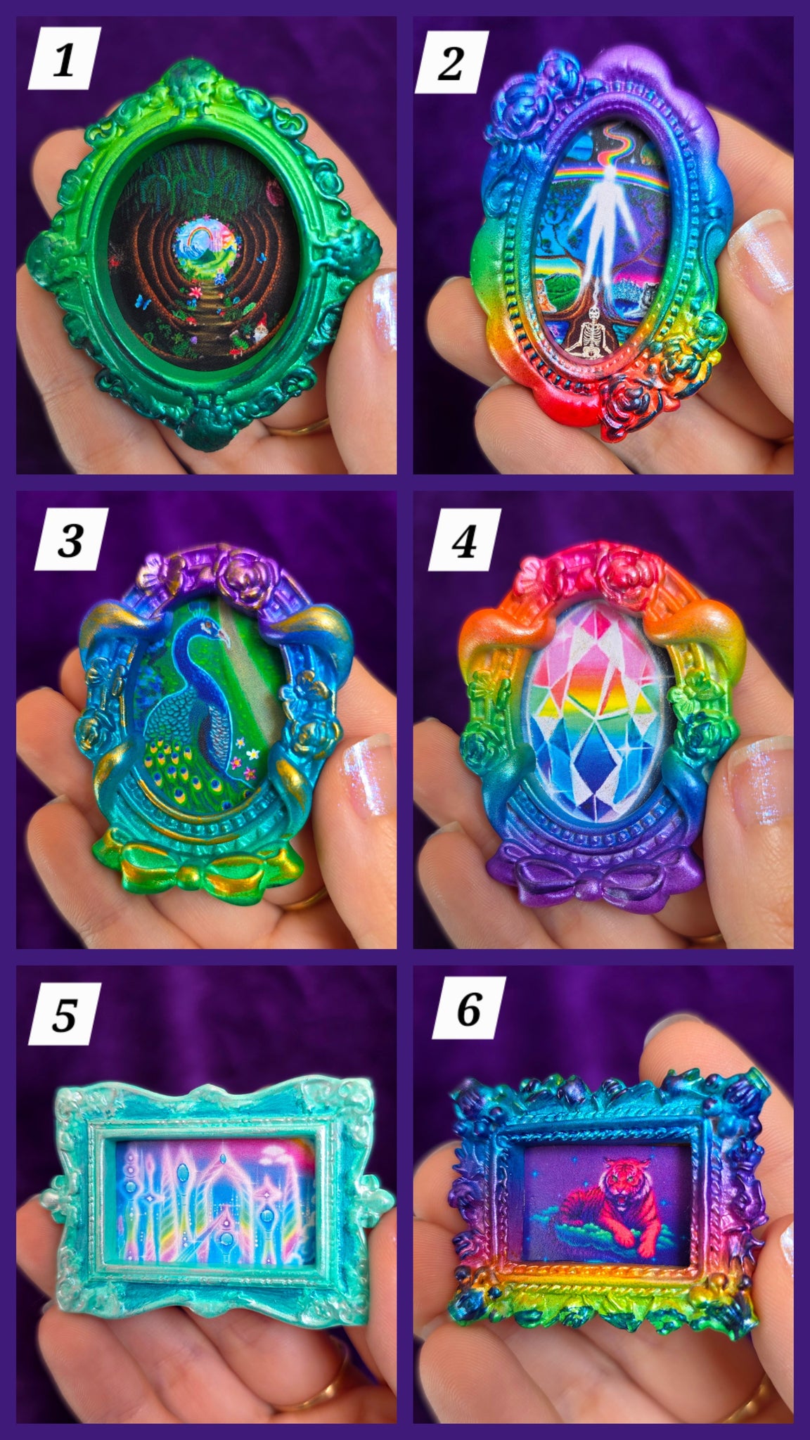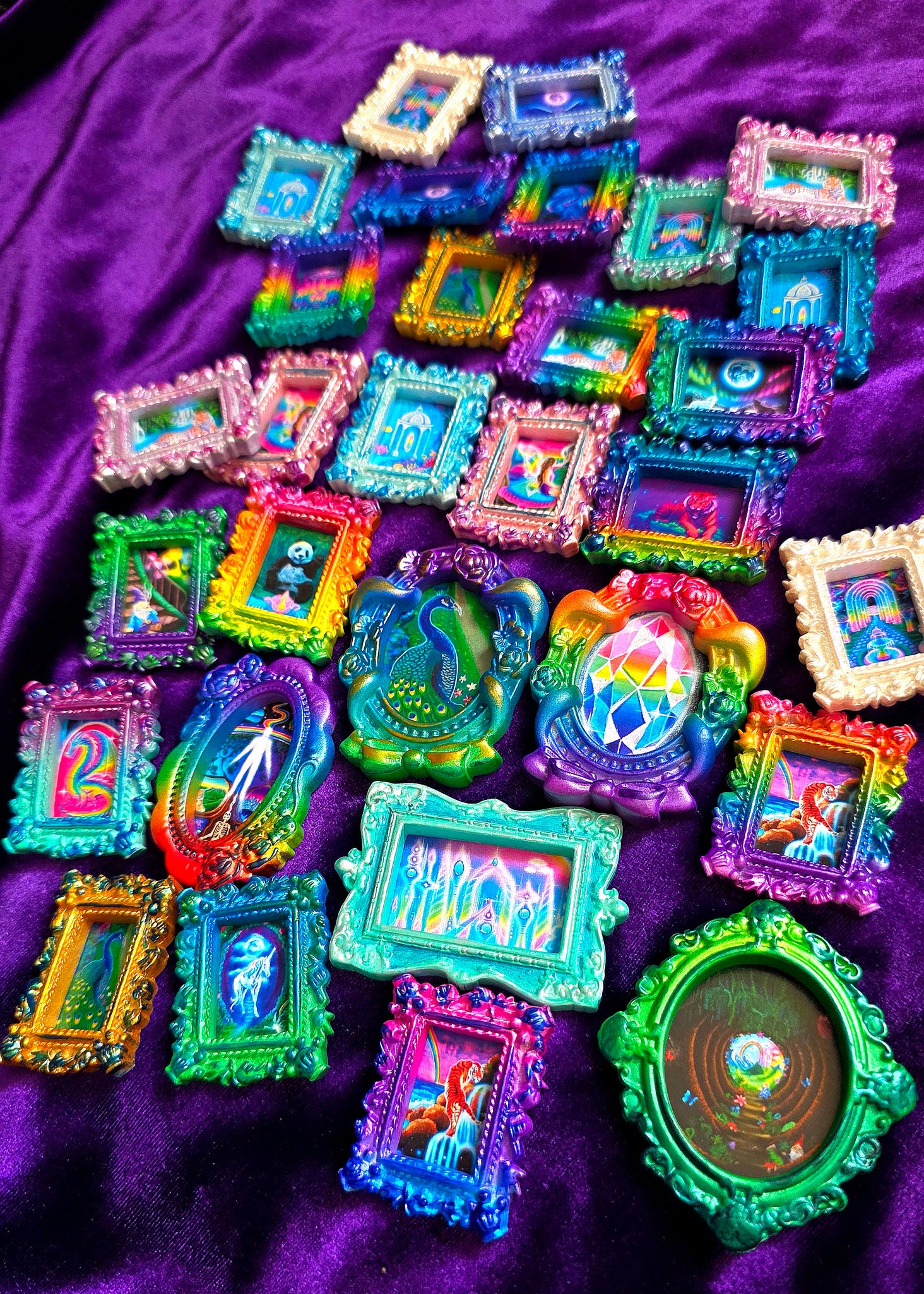 These special little curios are made with love and care over many hours of detailed and meticulous work. From resizing multiple art pieces to fit the frames, priming and carefully painting gradients and details, cutting and gluing prints, backings, and magnets. Each one holds special energy only handmade art can emit!
